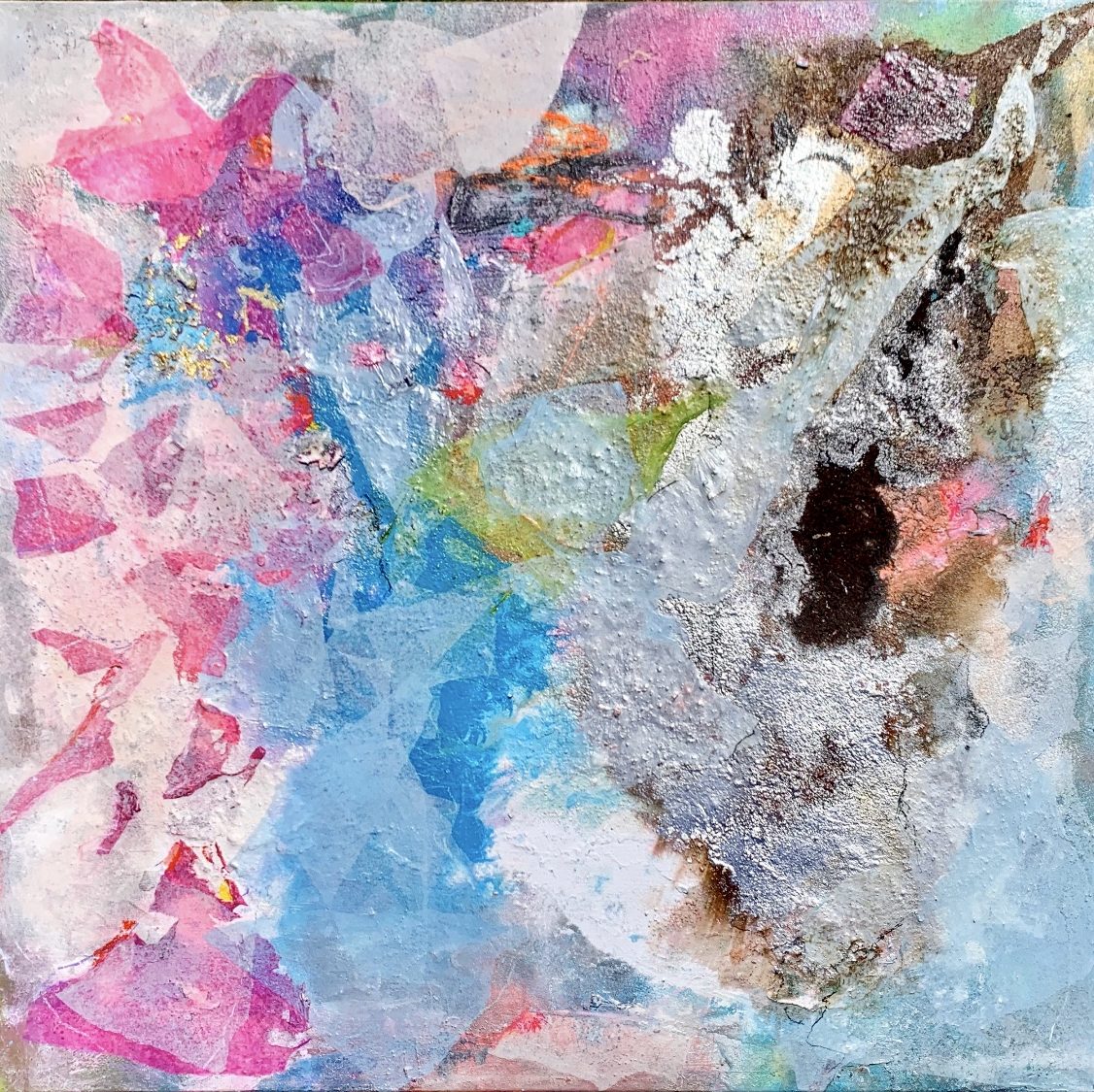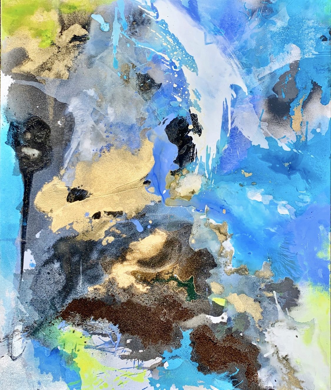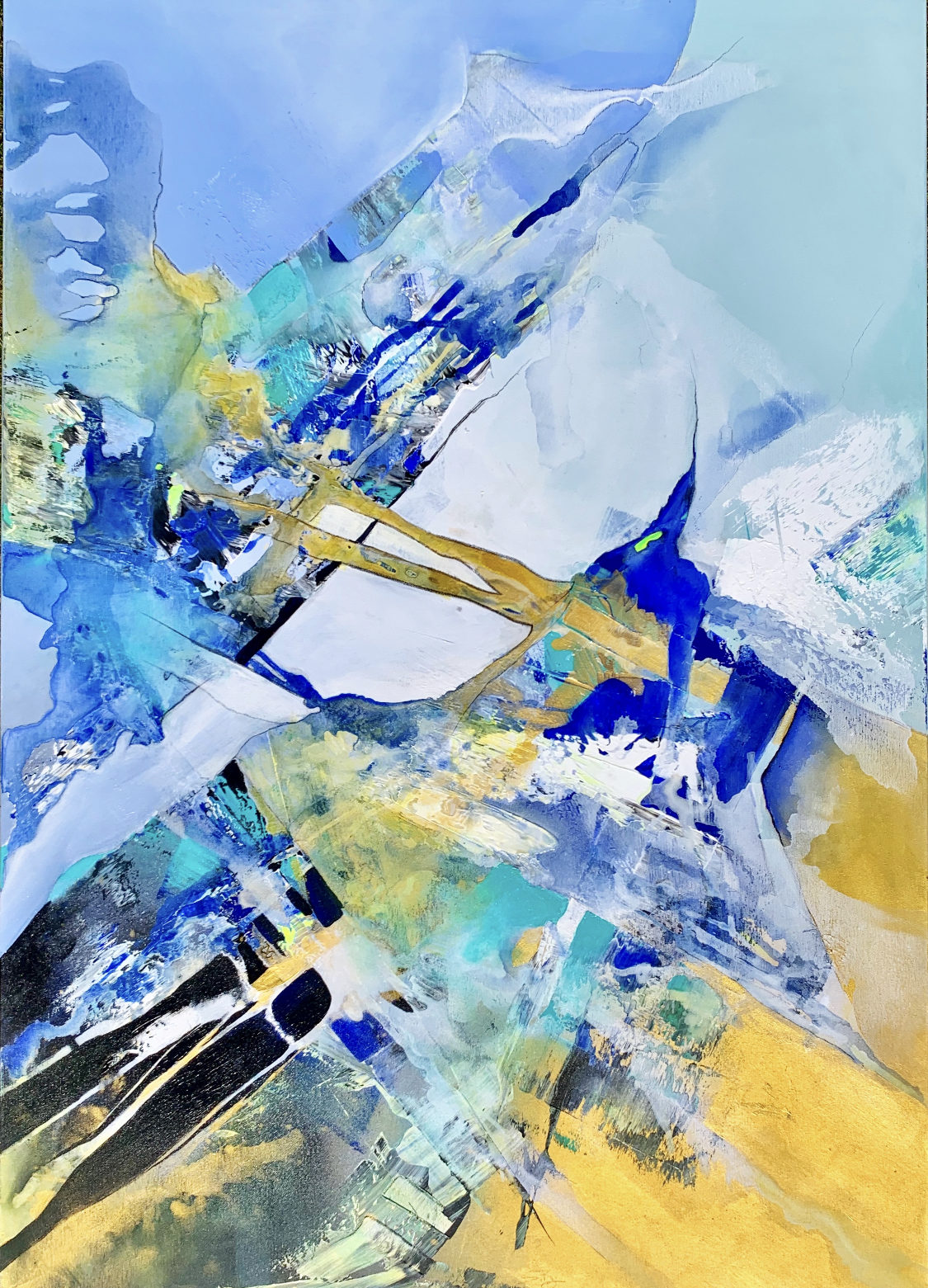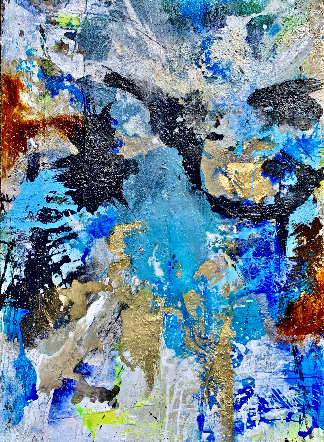 Meine bevorzugte Technik ist derzeit das abstrakte, prozesshafte Arbeiten unter anderem Collagen aus Chinapapier, Fundstücken, Ölfarben, Pigmenten, Wachs, Steinmehl, Schellack, Hautleim, Blattgold und Resin.